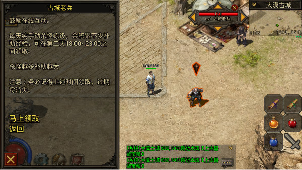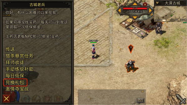 1.各位勇士在新手村达到15级之后,会自动传送到大漠古城,到了古城首先去安全区左下角(坐标293,352)处找古城老兵领取散人福利:论坛礼包,礼包里面有回城石,随机石,书页,喇叭。礼包码为:fgcs