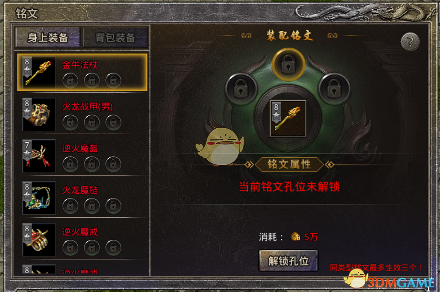 2、单件装备每打开一个铭文槽位,所需材料的代价都会变大,开启第一个槽位所消耗的材料为5万传奇币,第二个槽位为1个打孔石,开启第三个槽位则要3个打孔石。