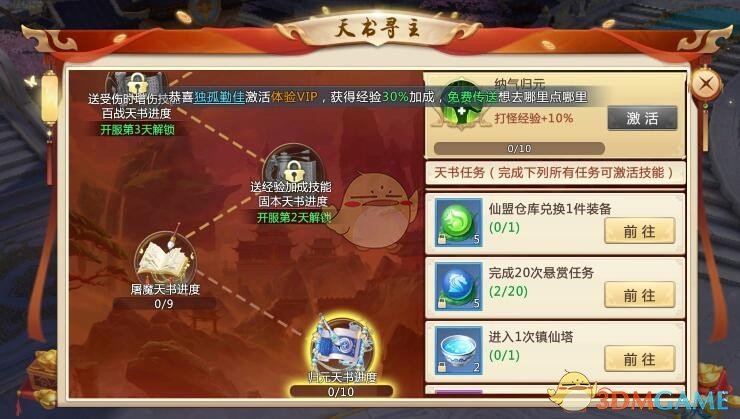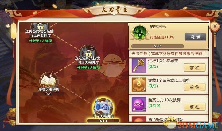 大家点击进入天书寻主之后,点击【归元天书进度】,可以在此页面右侧看到大家任务完成情况,没有完成的,可以点击【前往】完成。