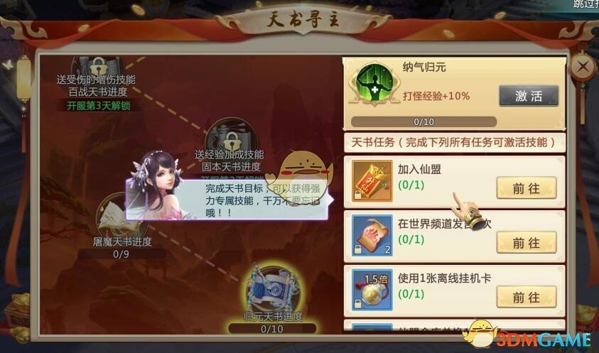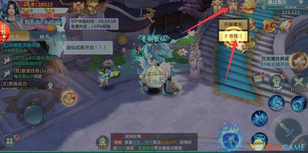 天书寻主是玩家达到一定的等级(60级左右)自动开启的,然后点击右上角的【开服活动】选择【天书寻主】就可以进入活动了!