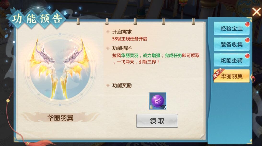 拉风华丽灵羽,战力增强;完成任务即可领取,一飞冲天,引领三界!