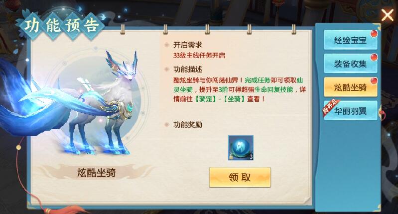 酷炫坐骑与你闯荡仙界!完成任务即可领取仙灵坐骑,提升至3阶可得超强生命回复技能,详情前往[骑宠] - [坐骑]查看!
