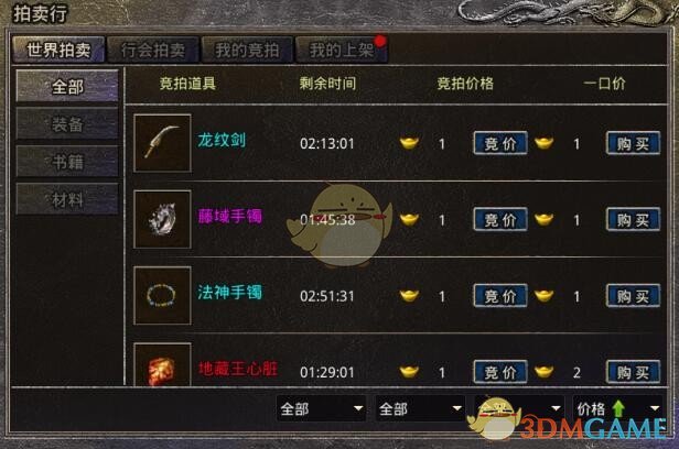 玩家上架道具,可选择以传奇币或者元宝进行定价起拍。