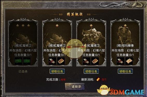 另外,“玉佩试炼”和“法阵试炼”副本门票获取需要一点小技巧,这两副本的门票获取涉及每日必做的另一个任务“精英挑战”:如下图所示,精英挑战每次随机刷新四个不同星级的任务,推荐尽可能刷新获取二星以上任务,因为只有二星以上任务才可能获得“玉佩试炼”和“法阵试炼”的门票,同时会附送一个传奇币宝箱,每个箱子可以获得3000传奇币,相当划算。