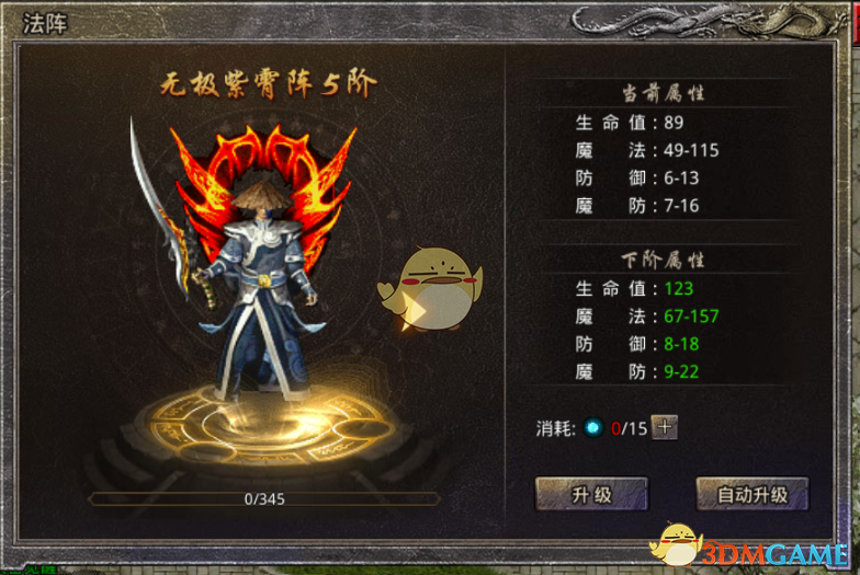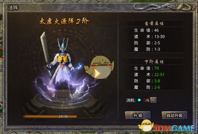 1、法阵一共16阶等,可通过消耗阵法之灵来提升,每提升1阶都会获得多种属性提升。