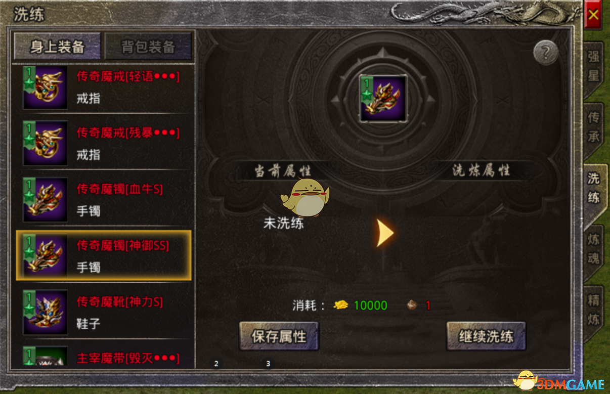 3、 洗练仅能对火龙及以上品质装备进行,且需要消耗对应装备的洗练石和金币。