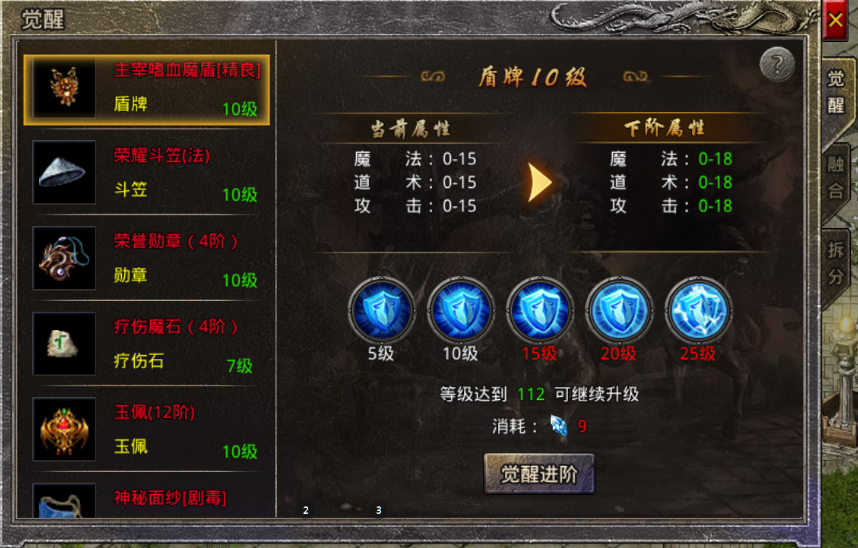 1、玉佩、盾牌、勋章、斗笠、疗伤石、面纱可进行装备觉醒。
