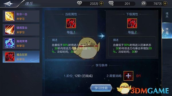 玩家血量低于30%将进入狂暴状态,30秒内将提升攻击力与暴击率。(12阶开启,需要雷霆一怒技能书)