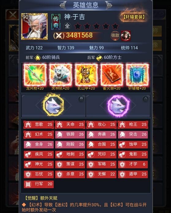 所以一个极限的于吉不是那种容易养的。第一回合于吉爆发很容易可以把对手的后排打没。我学的技能是幻术悲歌枪王攻心天命配合鬼影所有的技能都是针对后排。 攻心幻术可以有效的防止祝融的反弹第一回合你的超高攻击!
