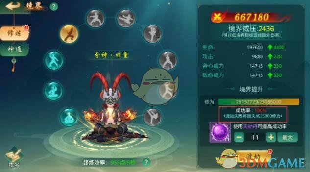当前修为条满格时会提示是否渡劫,建议成功率100%再渡劫,不然会损失修为。