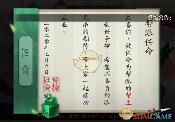 创建帮派则自动成为帮主,帮主拥有任命职位,研究功法,开启活动,宣战等权限。
