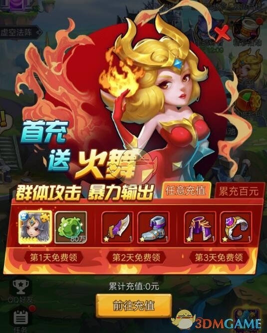 首充任意金额可以连续领三天礼包,在第一天就可以领到火舞!