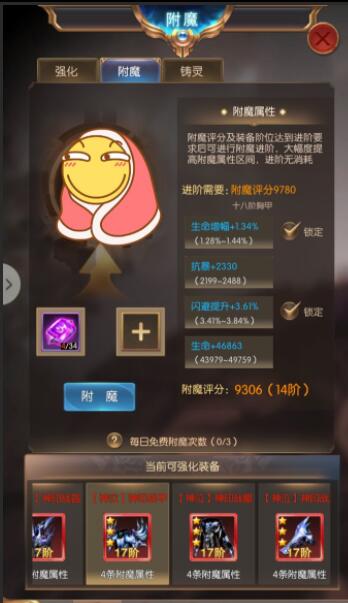 因为免费附魔次数有限,大家不要随便一件装备就附魔,挑选自己比较好的装备优先附魔!