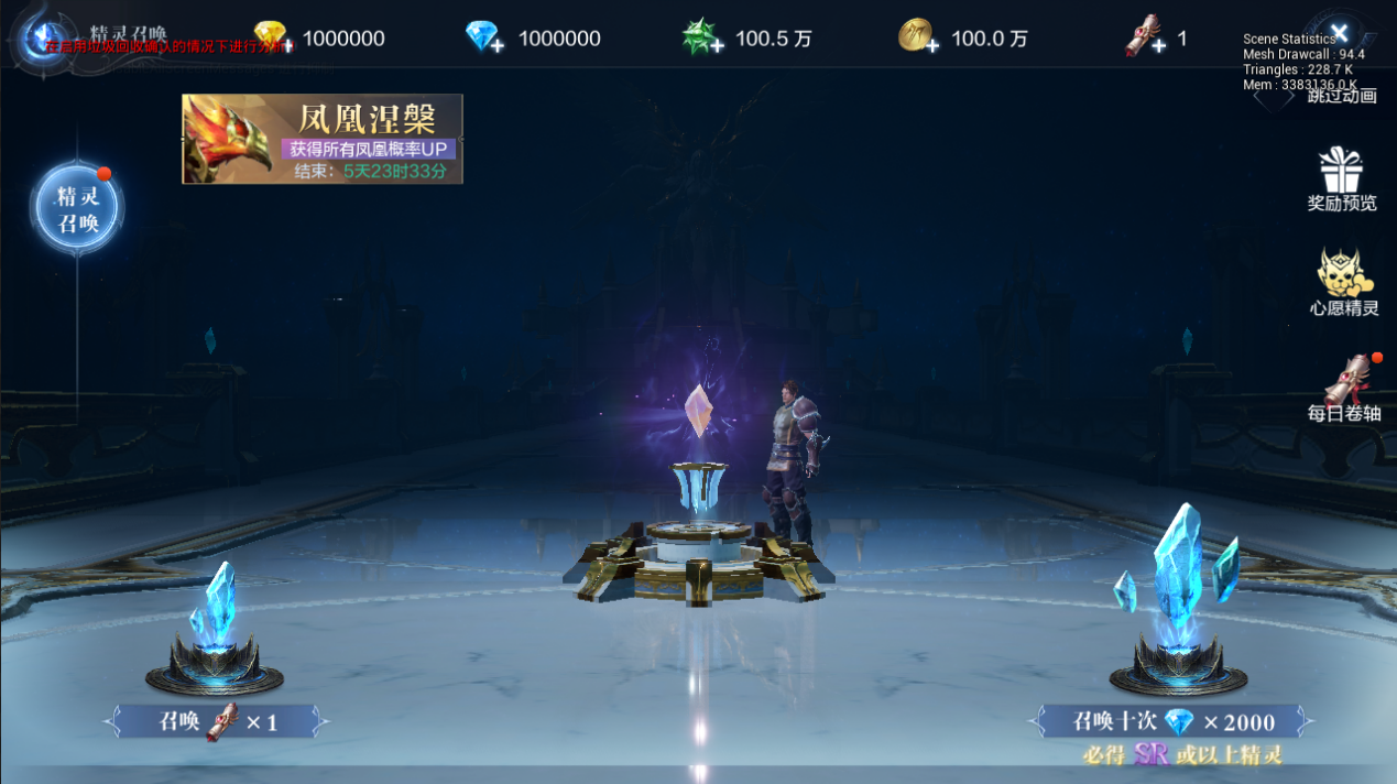 当服务器开启到一定的时刻时,游戏会同步开启精灵召唤活动。首期精灵召唤活动中,获得四只凤凰的概率均翻倍。