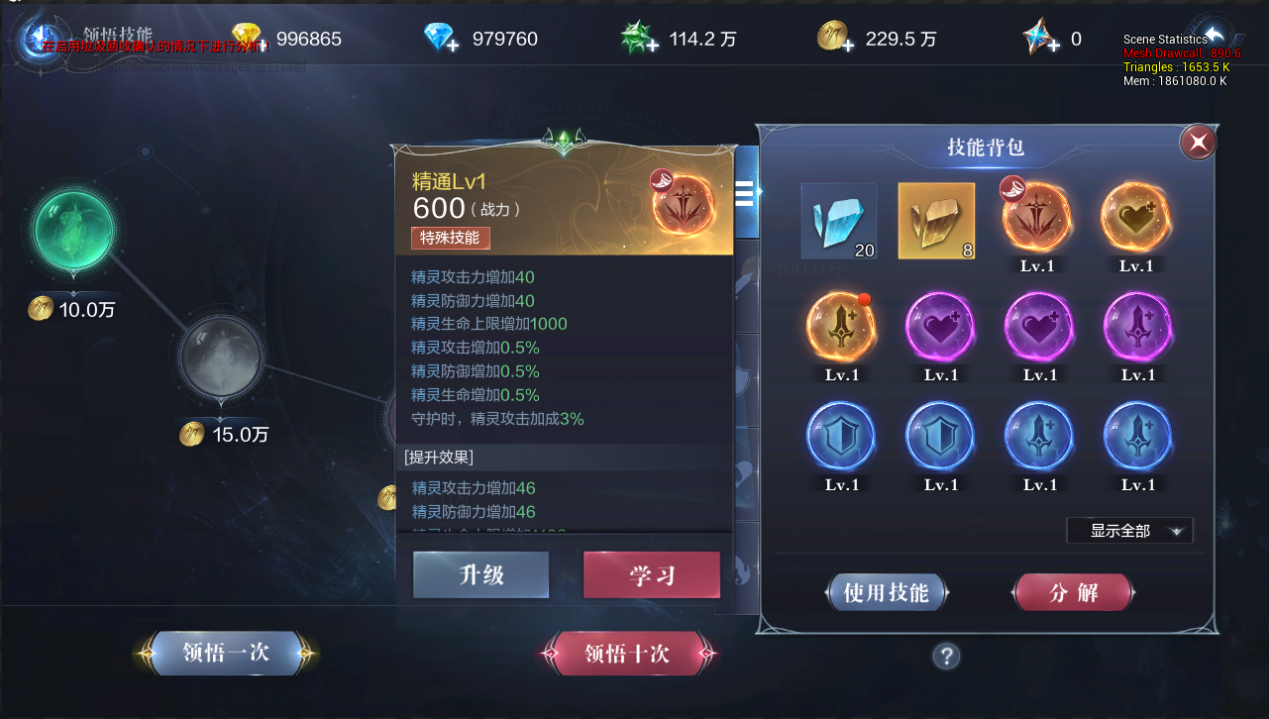 获得稀有的特殊技能,可以大幅提升属性。消耗低级技能、经验粉尘,升级技能等级,可以大幅增强技能效果。