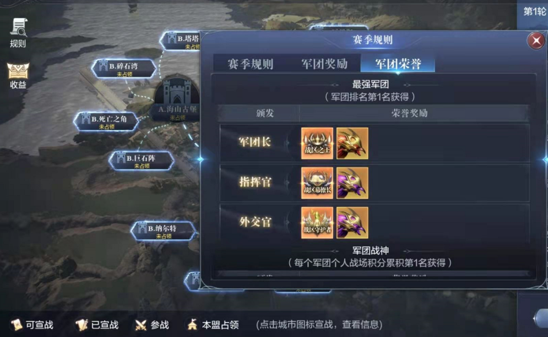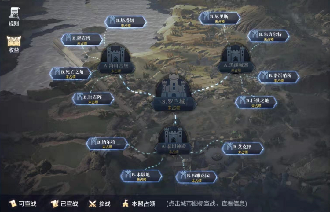 S级城市的难度自然更大一些,需要军团有战盟占领任意的A级城市时才可以进行宣战。所以相对较弱的战盟,最好选择守住一座B级城市就够了哦~