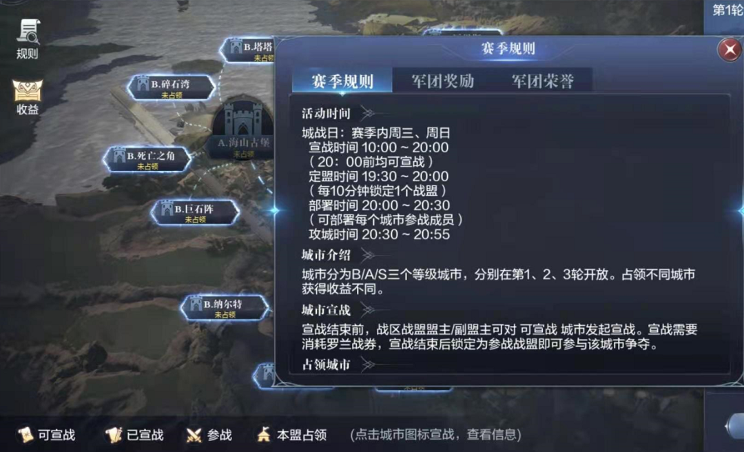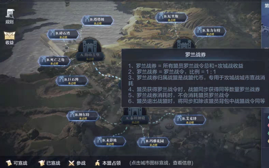 之前已经提到过,每个战盟是需要使用“罗兰战券”才可以对城市宣战的,而且每场城战只能有4个战盟一起参与,所以这注定了各个战盟在面对新颖的城市时必然要先进行一轮竞赛,价高者才能够对城市宣战。