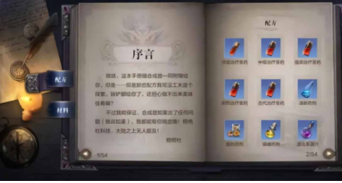 在制造部分,我们可以看到各种药剂以及相应的药剂信息,药剂信息包括相应的配方以及效果。当然,刚开始的时候,具体的药剂配方并不明确,我们可以根据给出的提示来自由摸索合成。