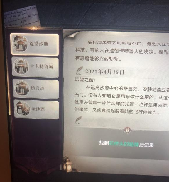 石桥头的路牌就在远离沙漠中心的悬崖旁边,这也是荒漠沙地任务需要我们找的,找到石桥头的路牌就能很快完成任务。