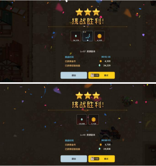 可以看到,这里我刷一次57级经验副本获得的经验是2万4,而40级副本有近2万的经验,相差17级的副本,经验只有4千左右差距,而角色50级后期每升一级需要的经验至少要4万,且等级越高需要越多,刷好几次才能给英雄升一级。由此可见,资源副本收益并不明显。所以这里并不推荐把体力用来刷资源副。