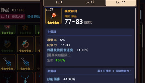 另外还有纯爱饰针,能加10%的武器恢复速度,同时增加10%技能伤害,还有5%暴击率,非常适合作为队长来使用,且竞技场中的输出表现也很优秀。