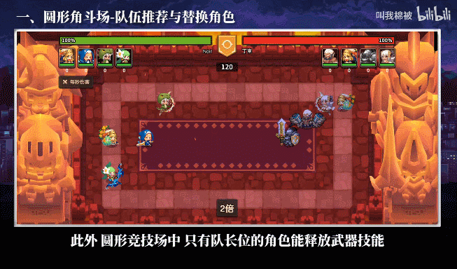 此外,圆形竞技场中,只有队长的角色能释放武器技能,血量会被提高12倍,其余队员为6倍,所以队长的选择也是很重要的,能优先打出组合技能的队伍,往往更容易获胜。