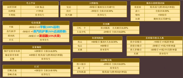 美食摊:只吃一个,队内随机一名英雄回血20%;大家开吃,-20银币全队回血20%;
