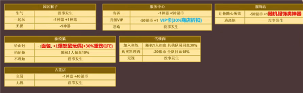 服务中心:客诉,-1神器+50银币;升级VIP,-50银币+1 VIP卡(30%商店折扣);忽略,没事发生;