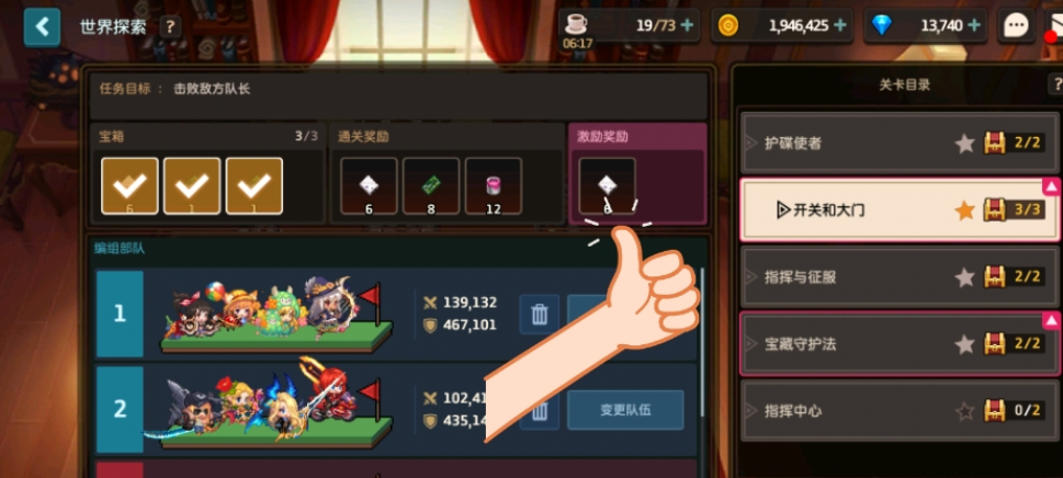 从关卡目录中我们能够看到红色箭头的关卡是带有激励奖励的,达成对应目标后扫荡关卡就能够获得。