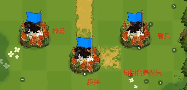 养兵,每个兵种每回合各养两只,左边城镇养枪兵,右边城镇养盾兵,下边城镇养步兵