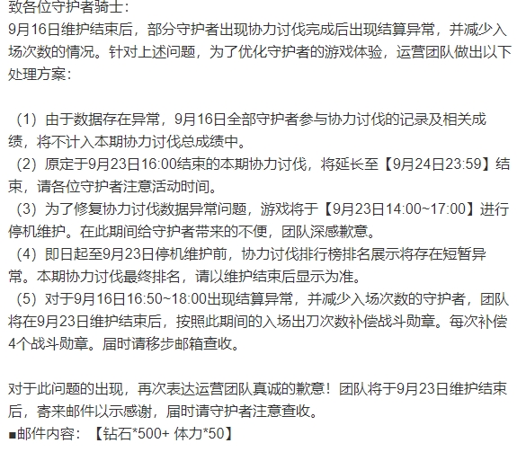 3、为了修复协力讨伐数据异常问题,游戏将于【9月23日14:00~17:00】进行停机维护。在此期间给守护者带来的不便,团队深感歉意。