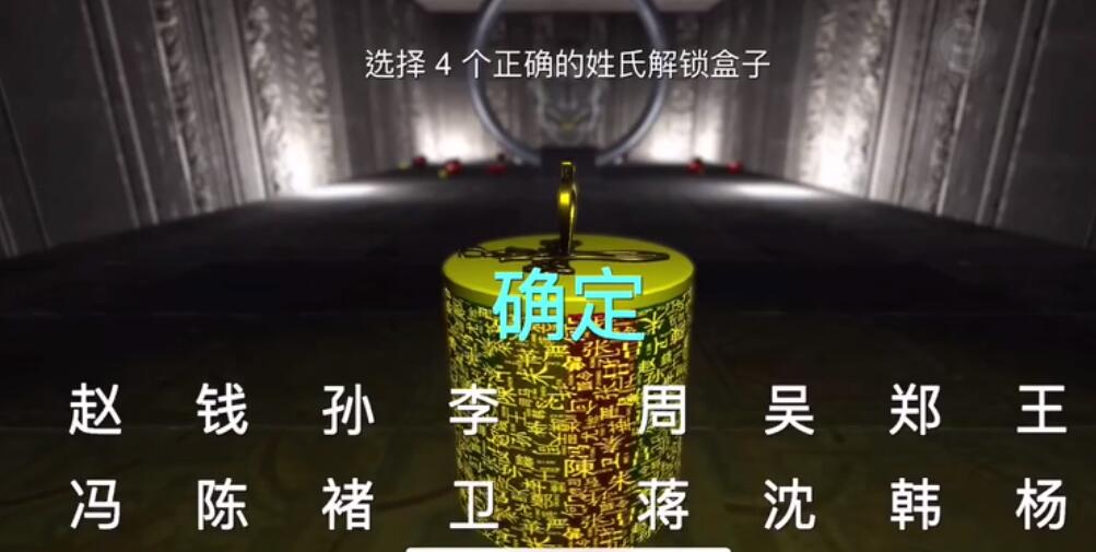 位置:在得到“石像声音”这个线索之后,向后看发现地面的密码盒子。输入正确的姓氏为赵,冯,郑,杨。解开盒子之后,查看盒子里面得到这个线索。(找到线索之后场景会突然变暗)