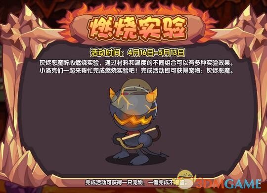 参加【4月16日-5月13日的燃烧实验】活动,完成活动即可获得宠物:灰烬恶魔。