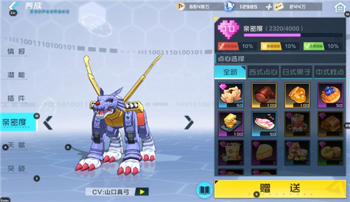 亲密度是需要玩家通过加工食物,然后对数码宝贝喂食进行提升,需要的数量巨大,建议大家尽量喂食数码宝贝喜好的食物,这样可以翻倍,提升亲密度以后,就可以获取到天赋点了。
