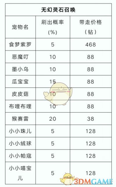 下面是无幻灵石召唤宠物,召唤内容及概率,以及对应洛克钻消耗: