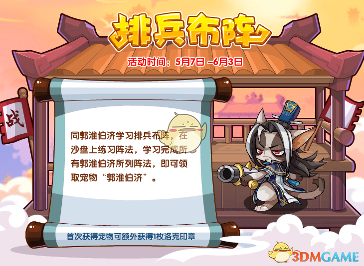 同郭淮伯济学习排兵布阵,在沙盘上练习阵法,学习完成所有郭淮伯济所列阵法,即可领取宠物“郭淮伯济”。