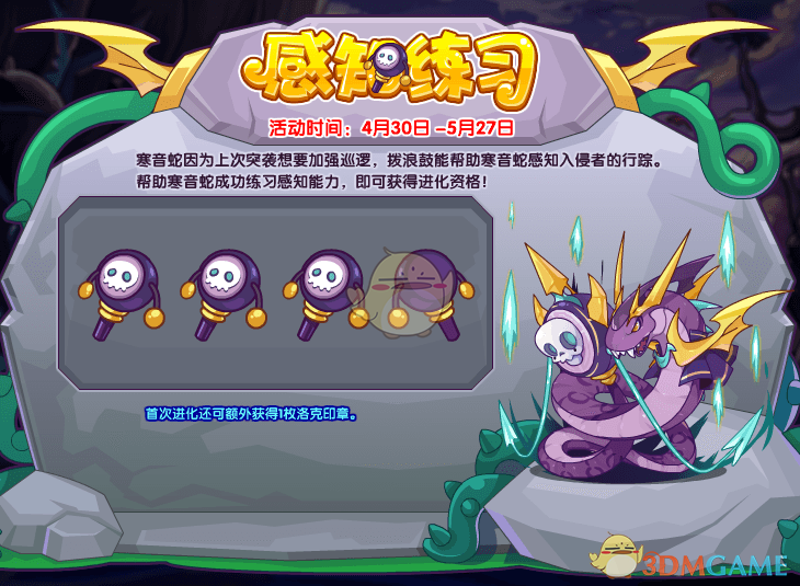 寒音蛇因为上次突袭想要加强巡逻,拨浪鼓能帮助寒音蛇感知入侵者的行踪,帮助寒音蛇成功练习感知能力,即可获得进化资格!