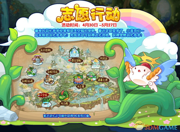 善良的羽化多多经常帮助天空城的宠物,最近求助变多了,小洛克们一起来帮助羽化多多吧!完成活动即可获得进化资格!特殊提醒:羽多可在彩虹河流捕捉获得。