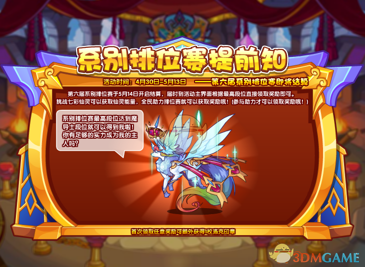 首先!第六届系别排位赛于5月14日开启结算,届时到活动主界面根据最高段位直接领取奖励即可。挑战七彩仙灵可以获取仙灵能量,全民助力排位赛就可以获取奖励哦!各位魔导士们加油,丰厚的奖励在等你们哦!