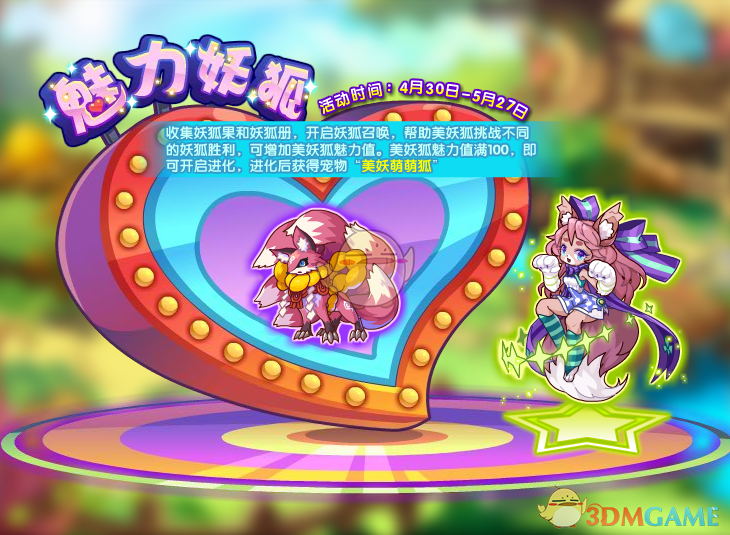 收集妖狐果和妖狐册,开启妖狐召唤,帮助美妖狐挑战不同的妖狐胜利,可增加美妖狐魅力值。美妖狐魅力值满100,即可开启进化,进化后获得宠物“美妖萌萌狐”。