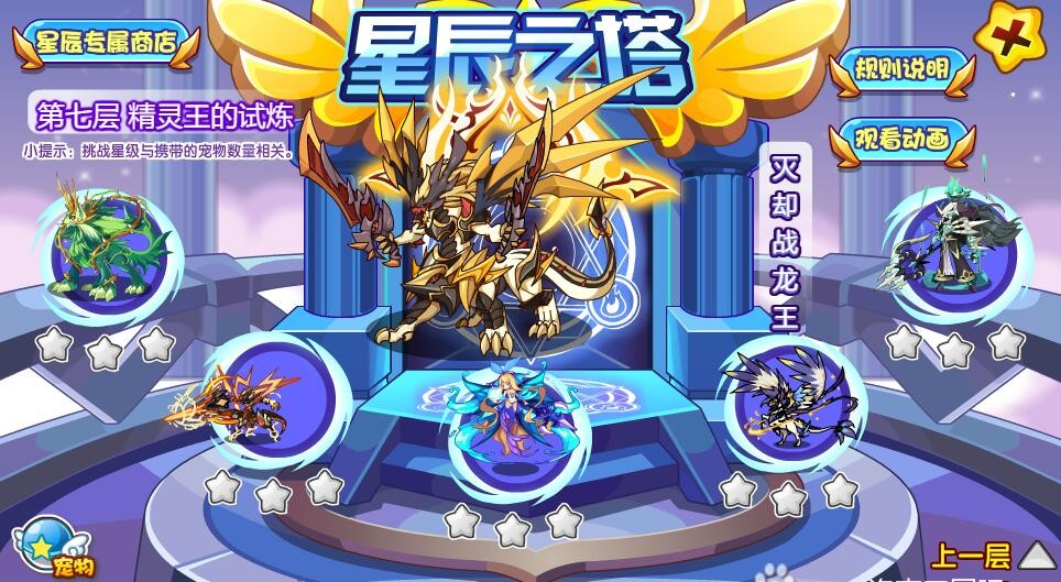 星辰塔的BOSS犹如当年的通天塔都是很有难度的,且免控,注意看塔里的规则,这边建议打到三星这样通一次就够了。