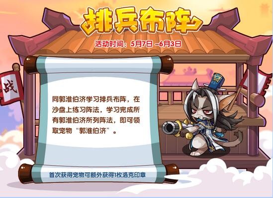 同郭淮伯济学习排兵布阵,在沙盘上练习阵法,学习完成所有郭淮伯济所列阵法,即可领取宠物“郭淮伯济”。