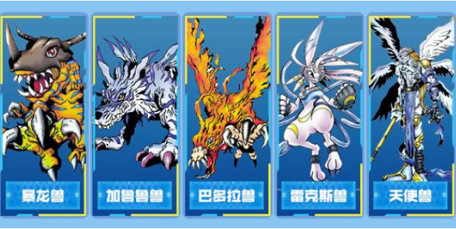 2、供玩家们选择的五个数码宝贝分别是:大地暴龙兽、海狮兽、狮子兽、仙女兽以及向日葵兽;