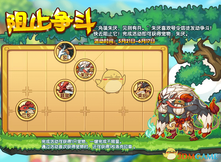 “凫篌朱厌,见则有兵。”朱厌喜欢号令信徒发动争斗!快去阻止它!完成活动即可获得宠物:朱厌。