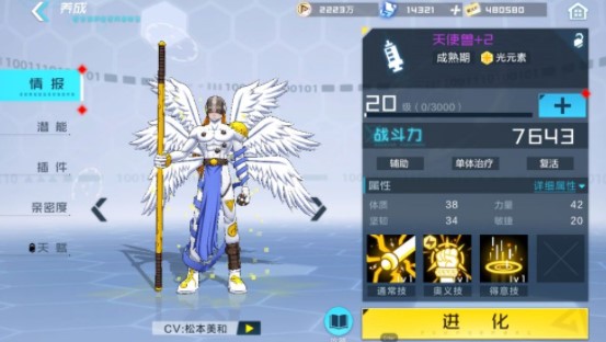 天使兽是一个辅助类型,主要依靠给对面造成伤害从而恢复我方最低生命数码宝贝的血量。