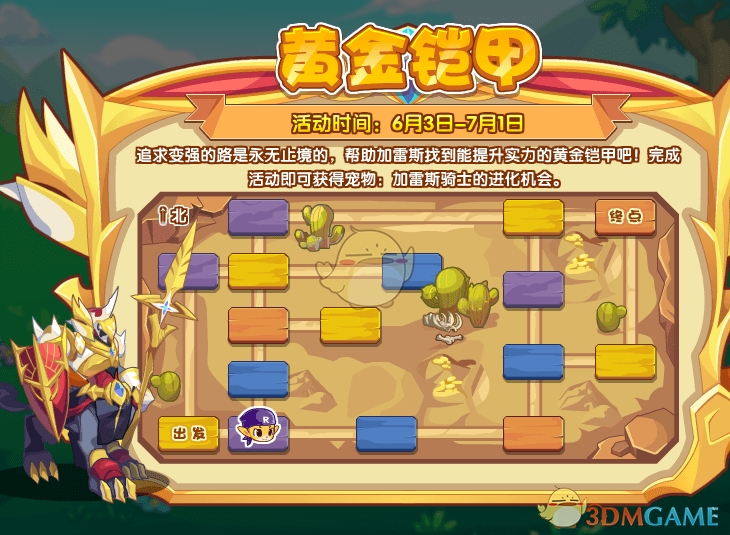 追求变强的路是永无止境的,帮助加雷斯找到能提升实力的黄金铠甲吧!完成活动即可获得宠物:加雷斯骑士的进化机会。