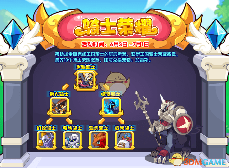 帮助加雷斯完成王国骑士的层层考验,获得王国骑士荣耀徽章,集齐10个骑士荣耀徽章,即可兑换宠物:加雷斯。