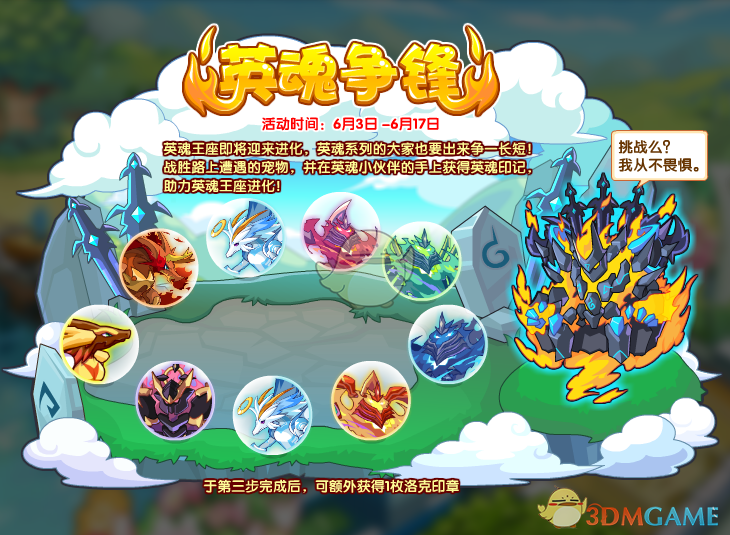 英魂王座即将迎来进化,英魂系列的大家也要出来争一长短!战胜路上遭遇的宠物,并在英魂小伙伴的手上获得英魂印记,助力英魂王座进化!