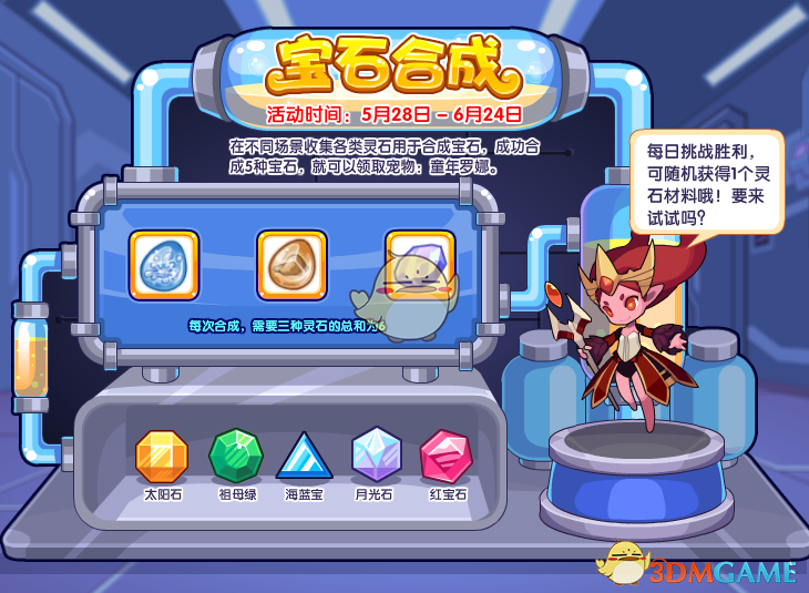 在不同场景收集各类灵石用于合成宝石,成功合成5种宝石,就可以领取宠物:童年罗娜。