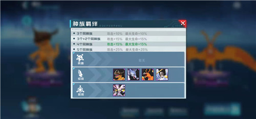 三个同种族数码兽+两个同种族数码兽:攻击+15%、生命值上限+15%